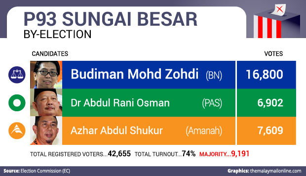BN candidate Budiman Mohd Zohdi retained the Sungai Besar seat for the ruling coalition with a majority of 9,191 over his rival Amanah’s Azhar Abdul Shukur, followed by Dr Rani Osman from PAS, according to official results from the Election Commission.