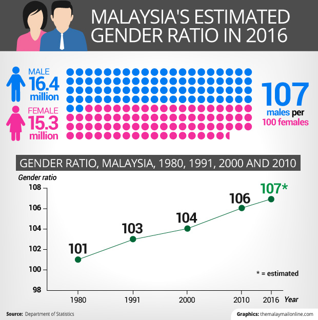 Malaysia’s gender ratio has been widening over the decades from 101 in 1980, to 103 in 1991, 104 in 2000 and 106 in 2010.