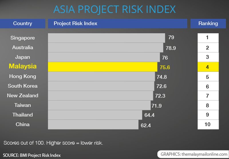 Malaysia ranked fourth out of 21 countries in the Asia Project Risk Index by the Fitch Group research house, beating neighbouring nations like Thailand (9th), Vietnam (11th), the Philippines (12th), Indonesia (13th), Cambodia (20th) and Myanmar (21st).
