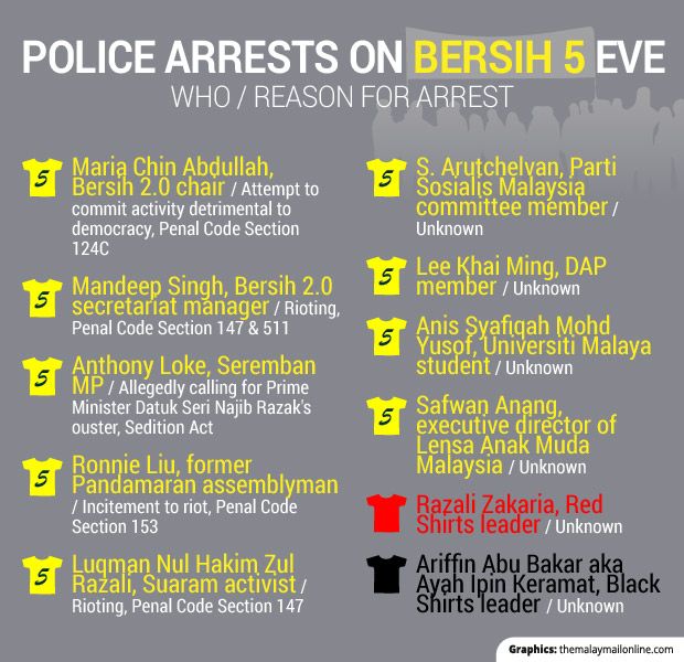 Some nine activists and pro-Bersih politicians, including Bersih 2.0 head Maria Chin Abdullah, were arrested last night ahead of the Bersih 5 street demonstration today.