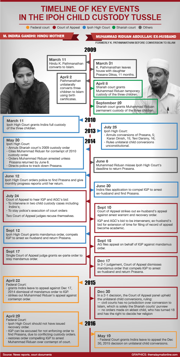 On April 29, the Federal Court had in a separate case ruled that the IGP must execute the warrant of arrest against Muhammad Riduan with the supervision of the Ipoh High Court, due to the Muslim convert failing to comply with the Ipoh High Court's order to return the youngest child to Indira — who had obtained custody for all three children.