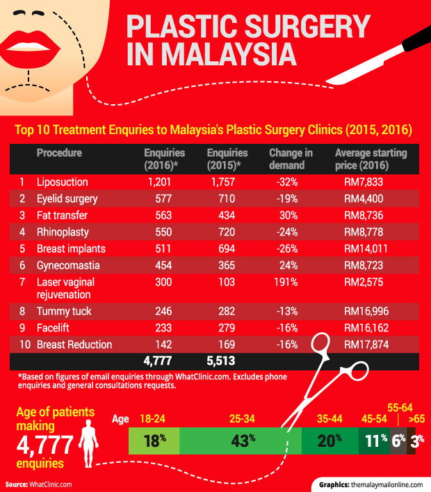 This was followed by breast implants, fat transfer and eyelid surgery, with the latter showing a marked decline of 28 per cent from 221 enquiries in 2015 to 160 enquiries last year.