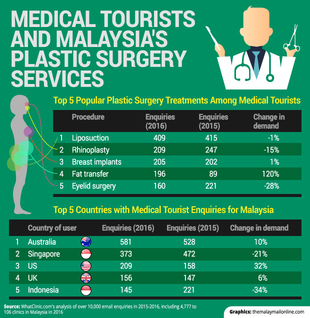 Medical tourists from Australia, US and the UK showed growing interest in plastic surgery services in Malaysia, with an annual growth last year of 10 per cent, 32 per cent and 6 per cent respectively, while the two other countries in the top five list — neighbours Singapore and Indonesia — showed lesser demand with a fall of 21 per cent and 34 per cent respectively.