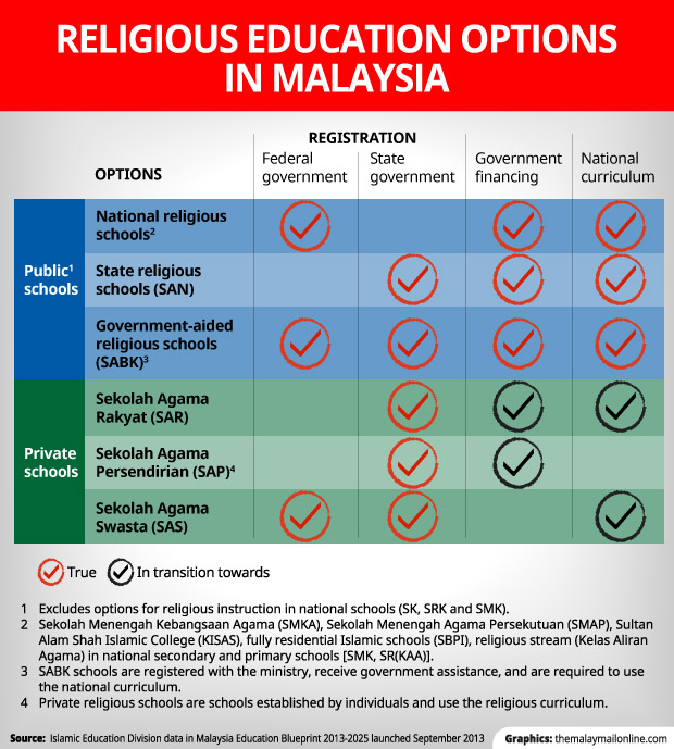 According to the ministry's Malaysia Education Blueprint 2013-2025 launched September 2013, there are broadly two main categories for religious schools — public and private.