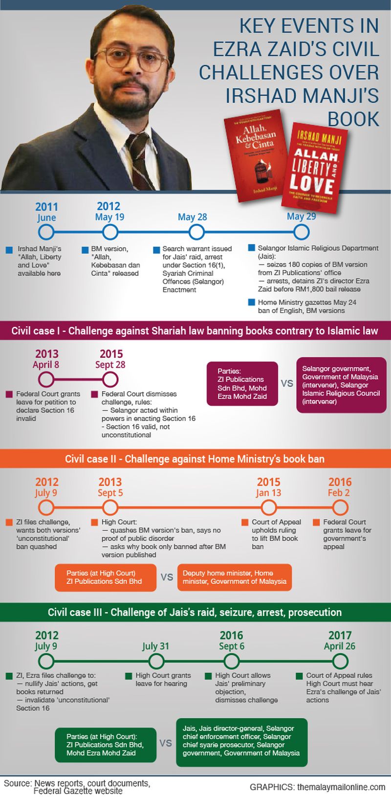 ZI Publications and Ezra are seeking for a number of court orders, including the quashing of Jais' raid and seizure on May 29, 2012 of 180 copies of the BM edition of Canadian writer Irshad Manji's book Allah, Liberty and Love and an order for the return of the books seized.