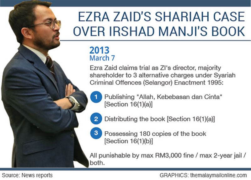 On March 7, 2013, Ezra was charged as ZI Publications' director and majority shareholder under Section 16(1)(a) with two alternative counts of publishing and distributing the Allah, Kebebasan dan Cinta book, as well as a third alternative count under Section 16(1)(b) for possession of 180 copies of the book.