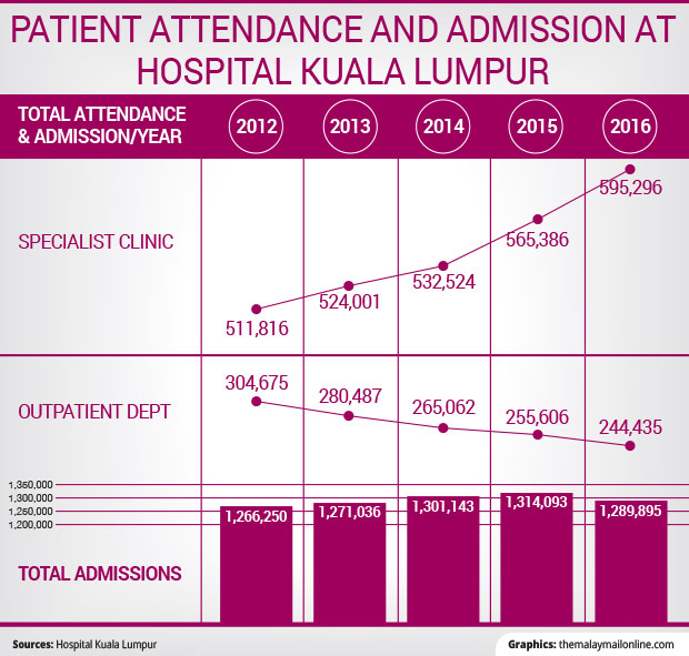 HKL’s figures provided to Malay Mail Online showed 1,266,250 admissions in 2012, increasing by just 1.9 per cent to 1,289,895 admissions last year. Admissions at the public hospital’s specialist clinics, however, rose about 16 per cent from 511,816 to 595,296 in the same period.