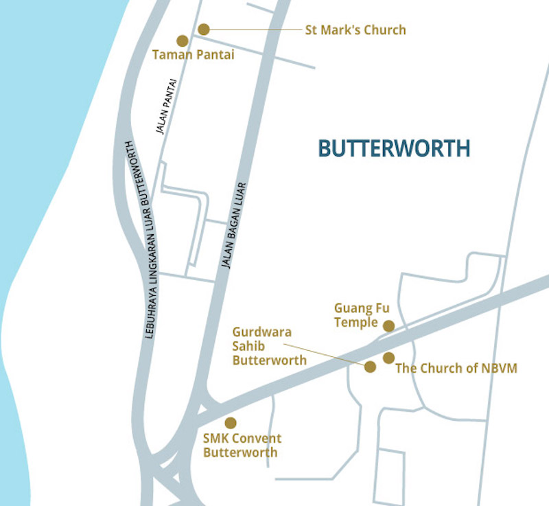 Well, Butterworth too has its very own “street of harmony” where two churches, a gurdwara and a Buddhist temple can be found within a short distance of each other.