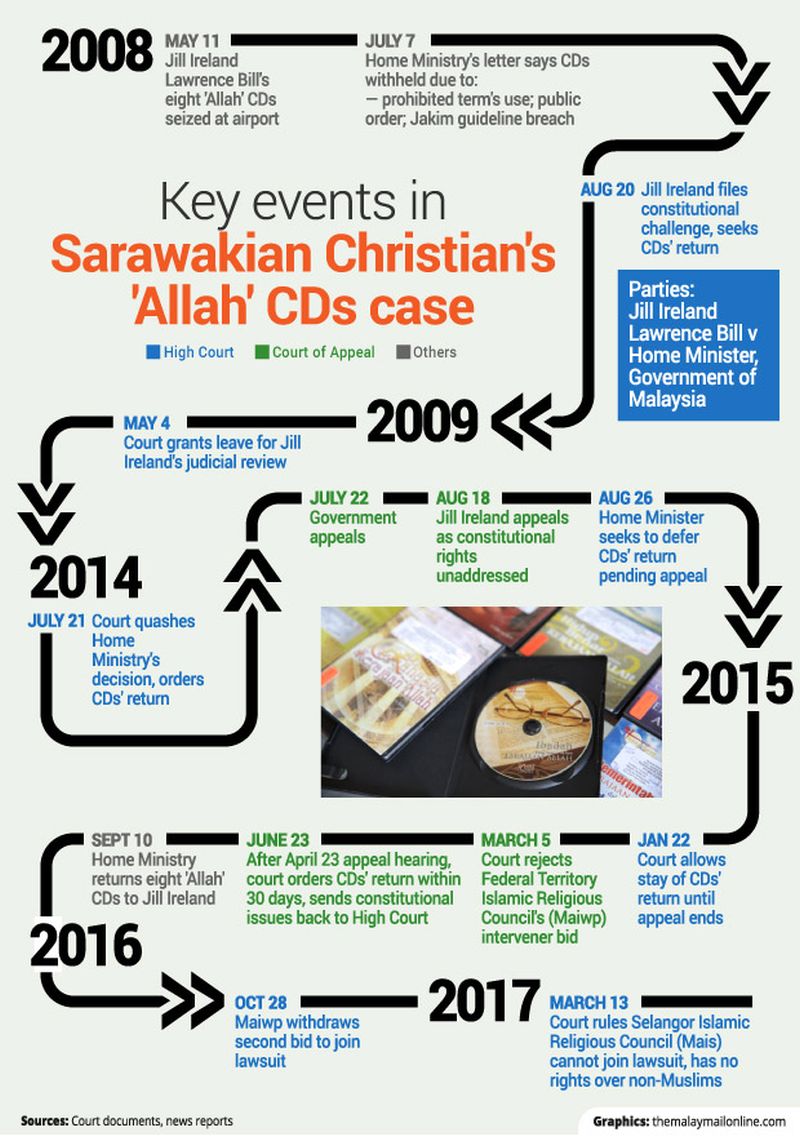 Jill Ireland is also asking the court to declare the Home Ministry’s December 5 1986 circular to ban the word “Allah” in Christian publications as unconstitutional and unlawful, arguing among other things that the government has failed to prove such use was a threat to public order.