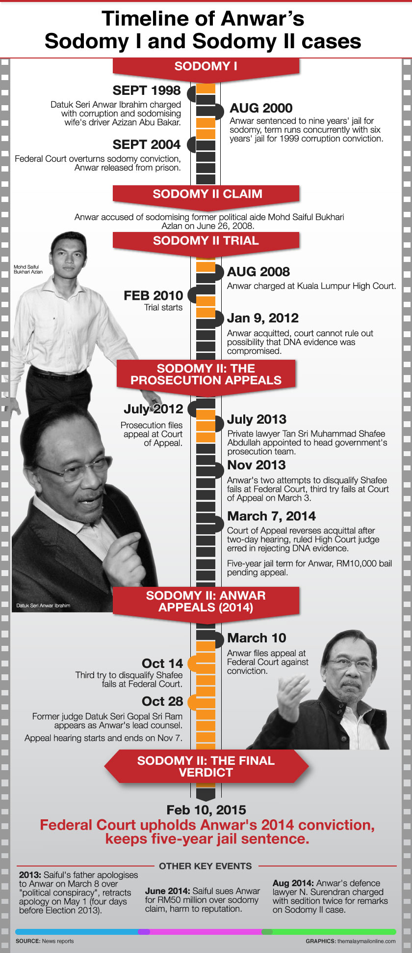 Anwar was sentenced to his five-year sentence for sodomy in March 2014, after the Court of Appeal found him guilty of the offence.