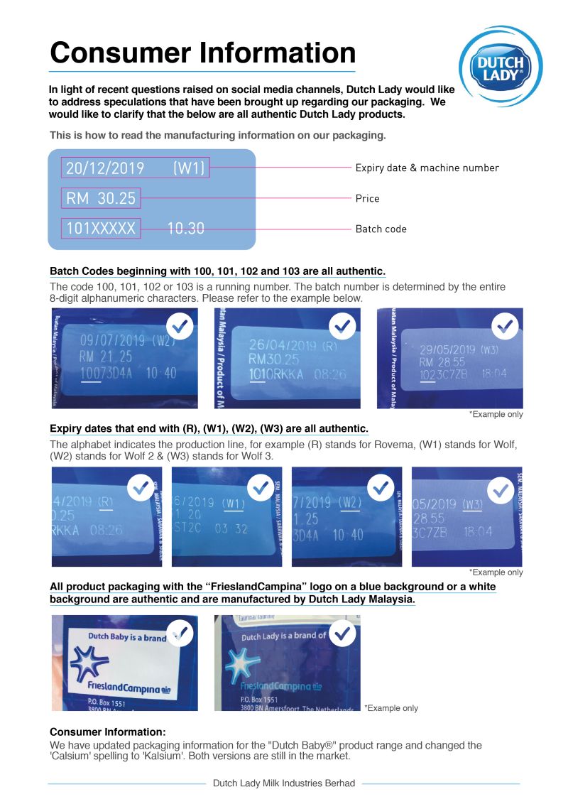 He said all authentic products begin with the batch codes of 100, 101, 102 and 103, expiry dates ending with (R), (W1), (W2) and (W3), spellings of both “Calcium” and “Kalsium”, and the FrieslandCampina logo with and without a white box.