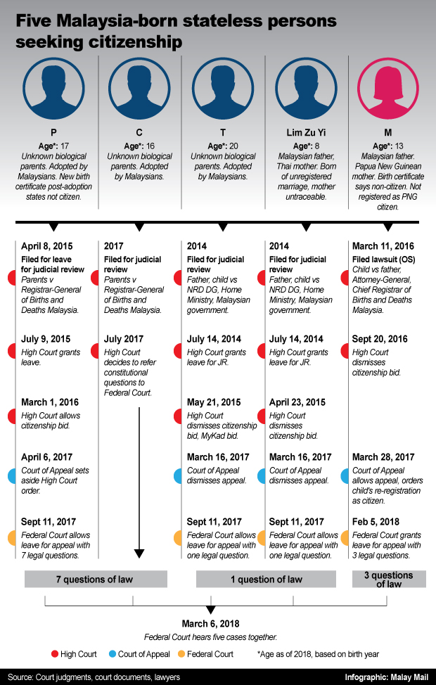 KUALA LUMPUR, March 6 — The Federal Court will jointly hear today five cases in which five stateless people born in Malaysia — to either Malaysian biological or adoptive parents — seek to know what is required for them to be declared as citizens.