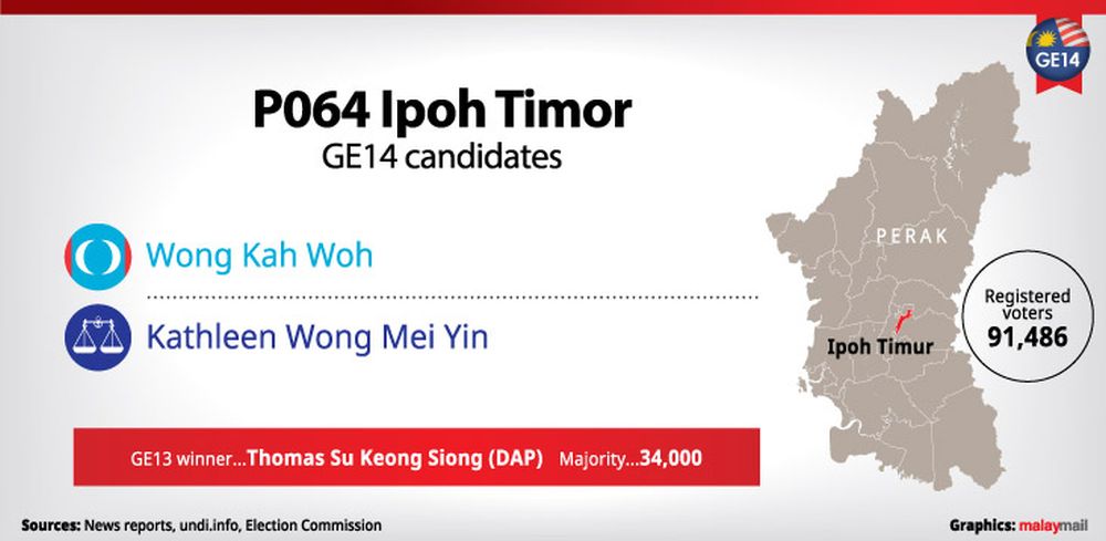 Ipoh Timor MCA Wanita chief Kathleen Wong Mei Yin, 41, will go up against Perak DAP secretary Wong Kah Woh, 37, for Ipoh Timor parliament.