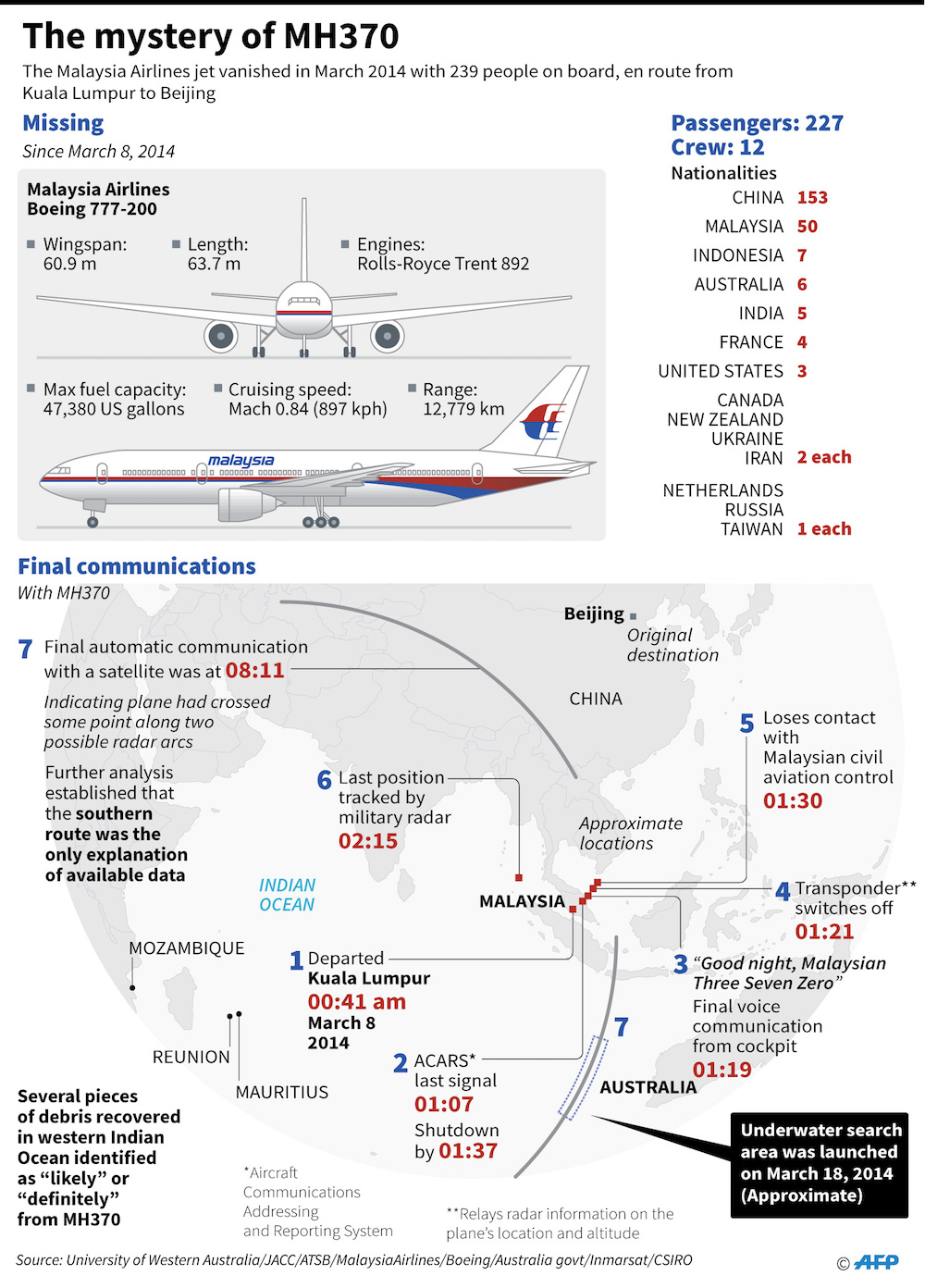Analysis of satellite communications with the aircraft shows the flight ended somewhere in the southern Indian Ocean off Australia.