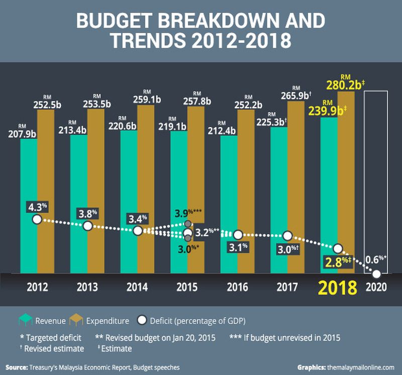 So with the expected extra income and mega-projects review and despite the GST scrapping and fuel price stabilisation, the government expects to only see its budget deficit increase from the original projected RM39.8 billion to RM40.1 billion.