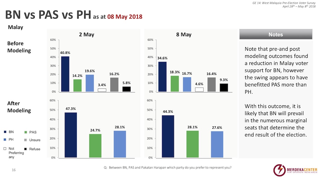 Despite predicting that BN would again lose the popular vote, Merdeka Center still expected the coalition to win enough seats to remain in power courtesy of the country’s first-past-the-post system.