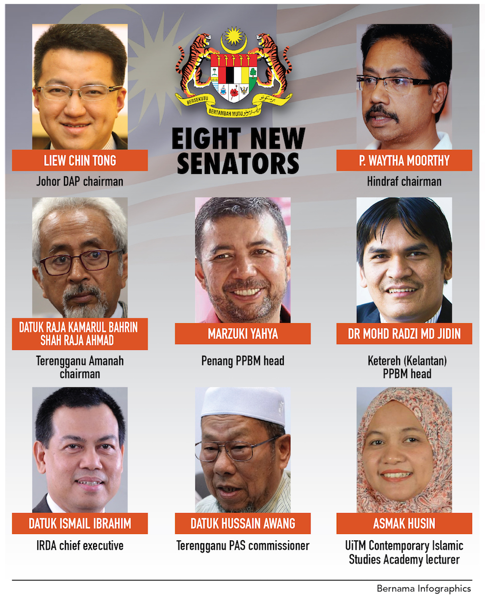 KUALA LUMPUR, July 17 — Architect Datuk Raja Kamarul Bahrin Shah Raja Ahmad, political strategist Liew Chin Tong, academician Dr Mohd Radzi Md Jidin, activist P. Waytha Moorthy, shipping company executive Marzuki Yahya, Muslim preacher Asmak Husin, as well as two veteran politicians, Datuk Ismail Ibrahim and Husain Awang, took their oath of office as senators today.
