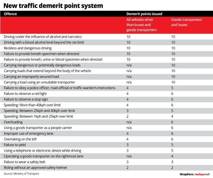 Demerit points range from a maximum of 10 points for offences such as drunk driving to two points for riding a motorcycle without an approved helmet.