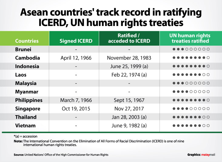 Malaysia is one of 14 countries in the world that has not signed or ratified ICERD, including Brunei, Myanmar, and North Korea.