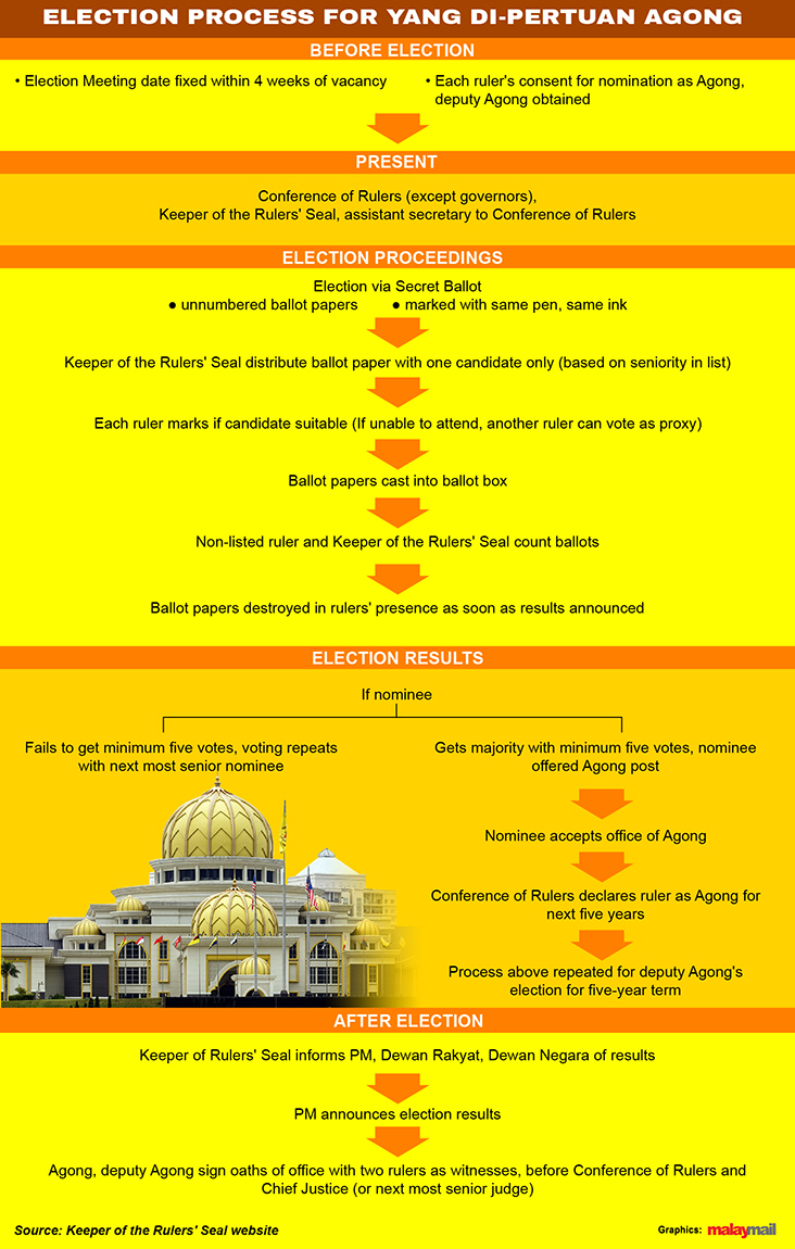 All nine Malay rulers will be able to vote for one of them to become the next Agong, with the selection process also based on a rotation basis.