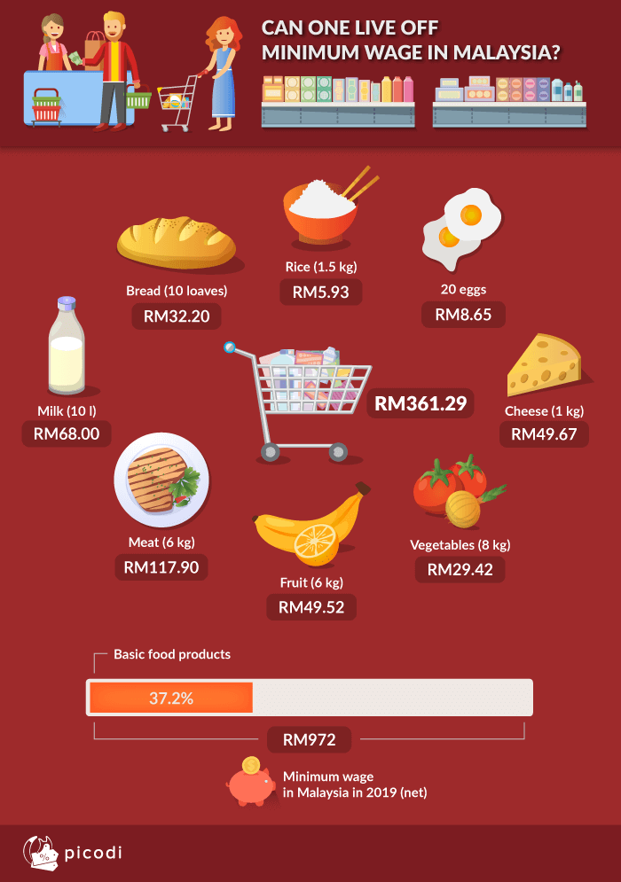 The average food basket compiled included 10 litres of milk for RM 68.00, 10 loaves of bread of RM32.30, 2.5kg of rice for RM5.93, 20 eggs for RM8.65, 6kg of beef and poultry for RM117.90, 6kg of fruit for RM49.52, 8kg of vegetables for RM29.42 and 1kg of local cheese for RM49.67, totalling RM 361.29.