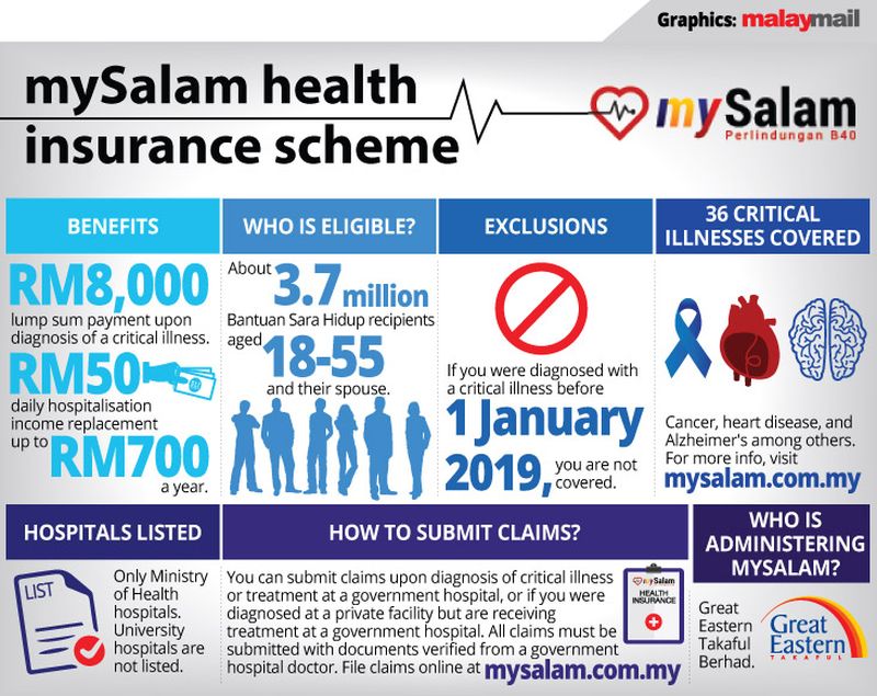 The government-run mySalam, which aims to cover 3.69 million people in the B40 group aged 18 to 55 and their spouses, provides a one-time RM8,000 lump sum payment upon diagnosis of one of 36 critical illnesses and RM50 daily hospitalisation income replacement up to RM700 per annum at any government hospital.