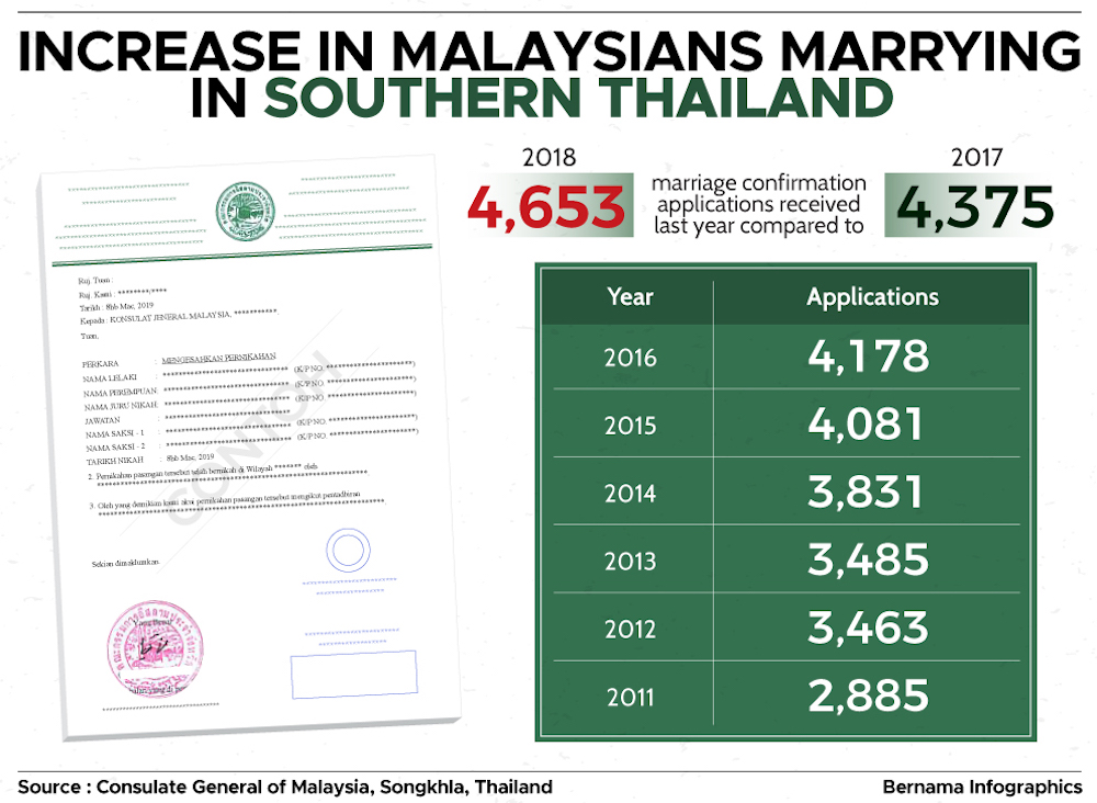 HATYAI, March 10 — The Consulate General of Malaysia in Songkhla, Thailand, has recorded a steady increase in the number of applications from Malaysians to obtain marriage verification letter since 2011.