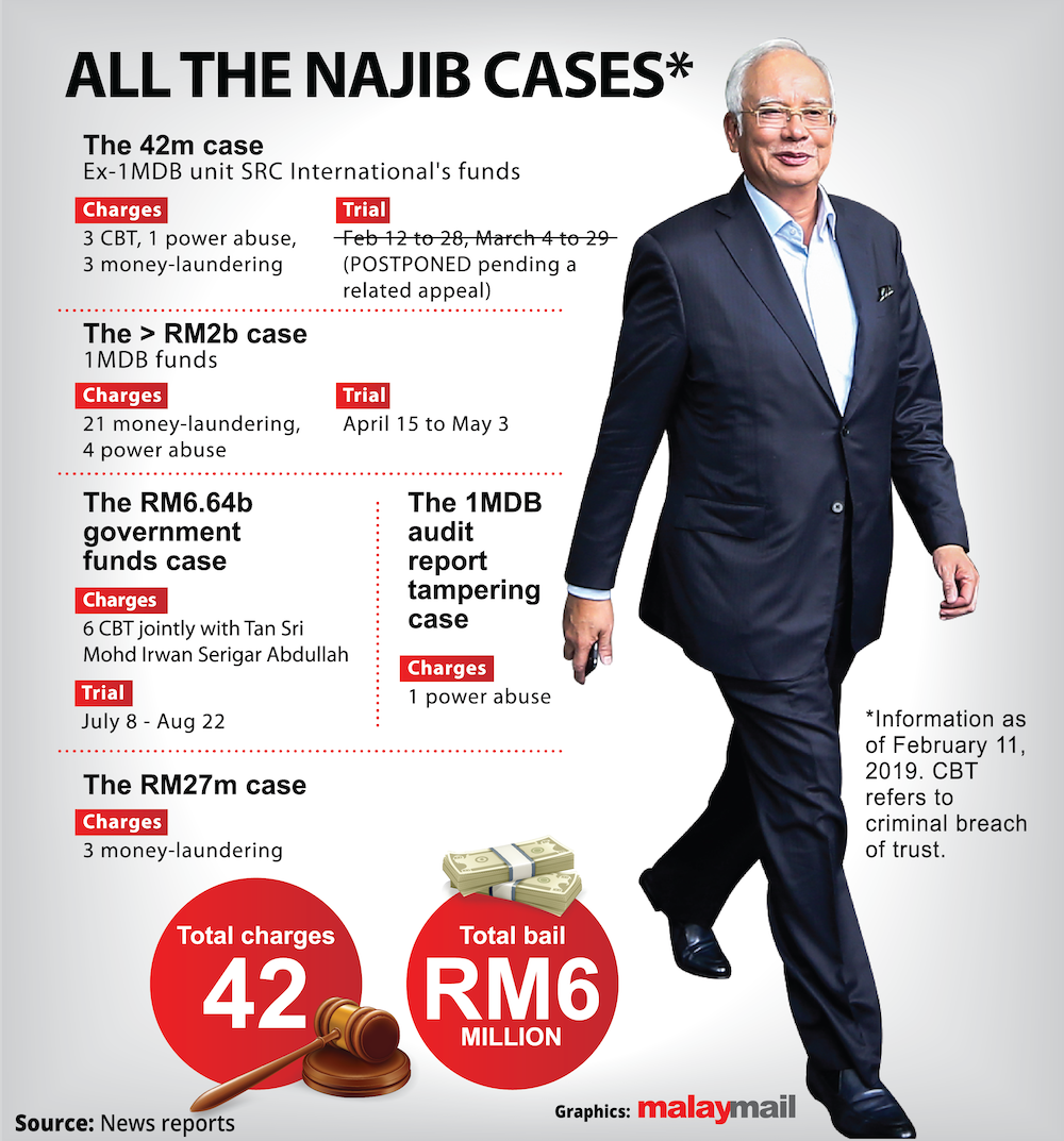 Najib’s trial in two of these criminal cases are set to start on April 15 and July 8 ― namely 25 charges over more than RM2 billion of 1MDB funds, and also criminal breach of trust of some RM6.64 billion of government funds.