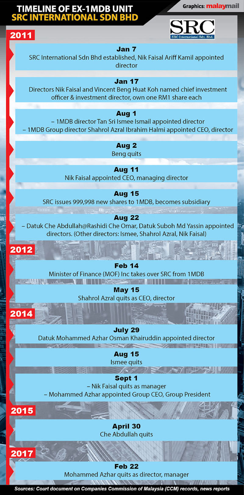 In CCM documents dated January 17, 2011, director Nik Faisal was revealed as also holding the post of chief investment officer in SRC International, while the only other company director Vincent Beng Huat Koh was appointed investment director.