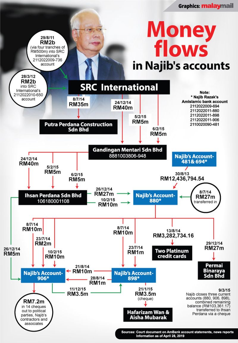 She said once Najib become prime minister in May 2009, his basic salary increased to RM22,826.65, with his total monthly income at RM58,605.15 up till April 2018, all deposited into his Affin Bank, account number 10040014008.