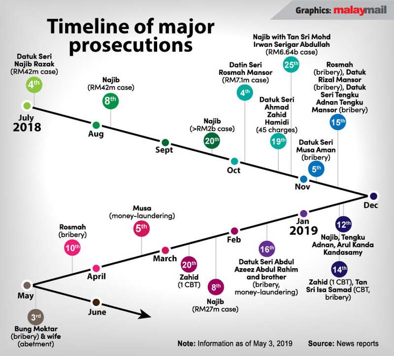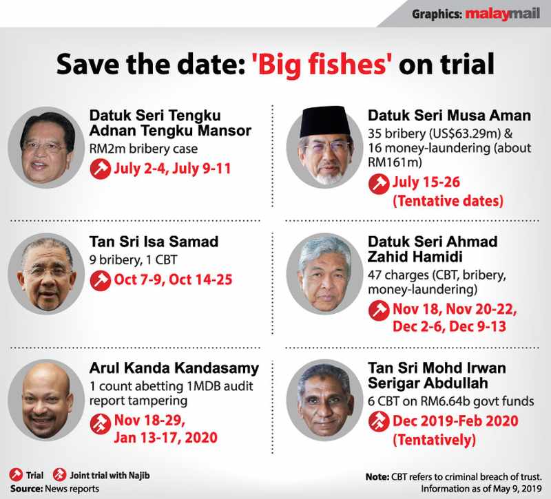 Here are the dates from July 2018 to early May 2019 where the “big fishes” were charged, all at the Kuala Lumpur court complex: