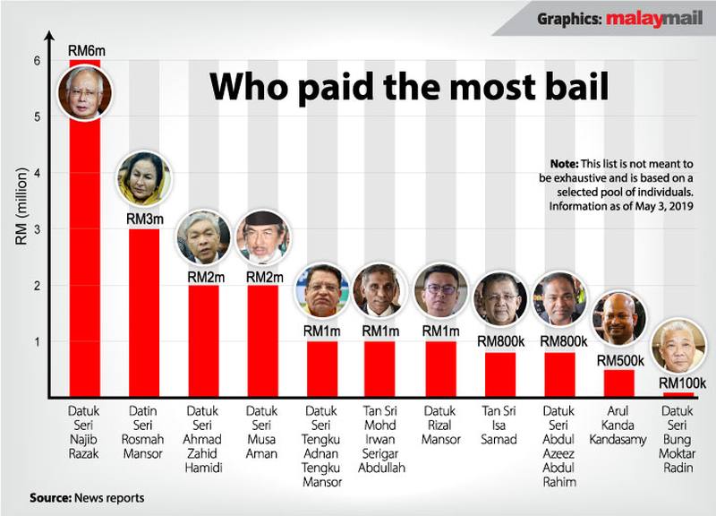 In the case of Najib whose salary was revealed in court recently, his lawyer had previously told Malay Mail that his second bail involving RM3.5 million was paid in multiple installments within a one-week deadline via crowdfunding, loans from friends and Najib’s personal Affin Bank account that “receives his salaries and pension from his years of service in government”.