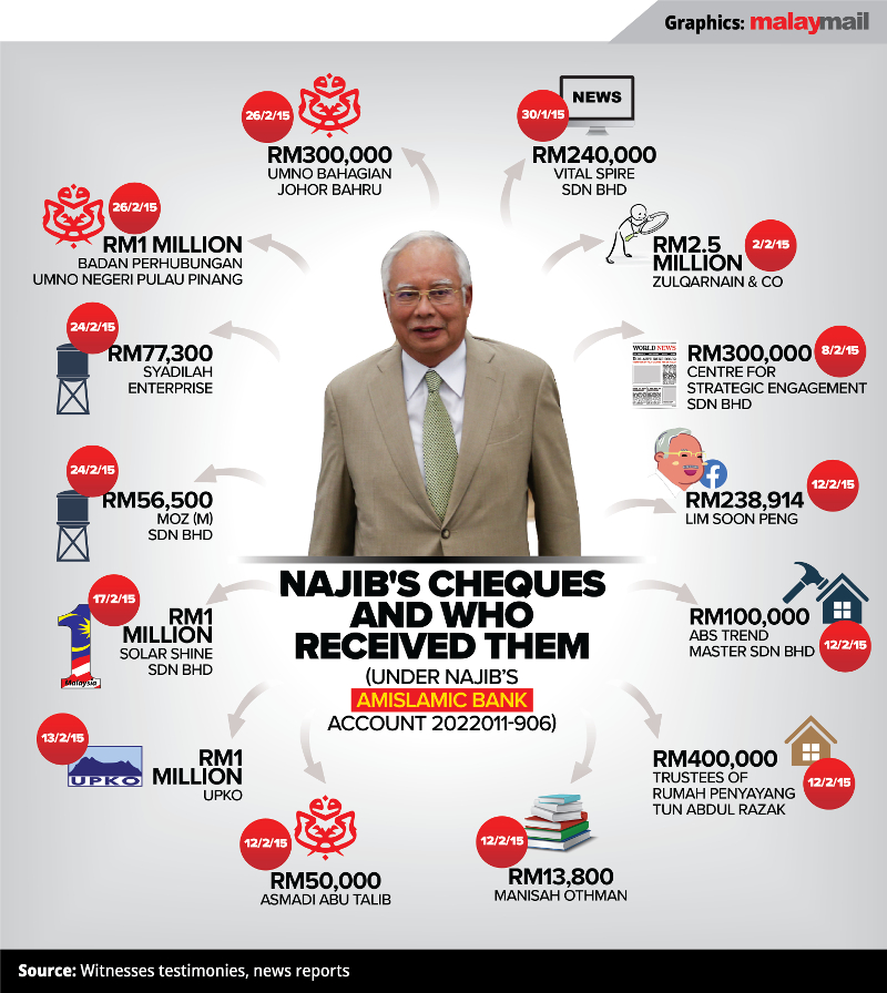 Malay Mail looks back at 14 cheques issued under Najib’s AmIslamic Bank account number 2022011-906 and what the cheques were used for, according to testimony given in court by the recipients.