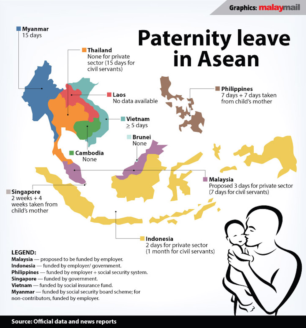 Five other countries in Asean legislate paternity leave in the private sector, most of which are borne by social security schemes or government.