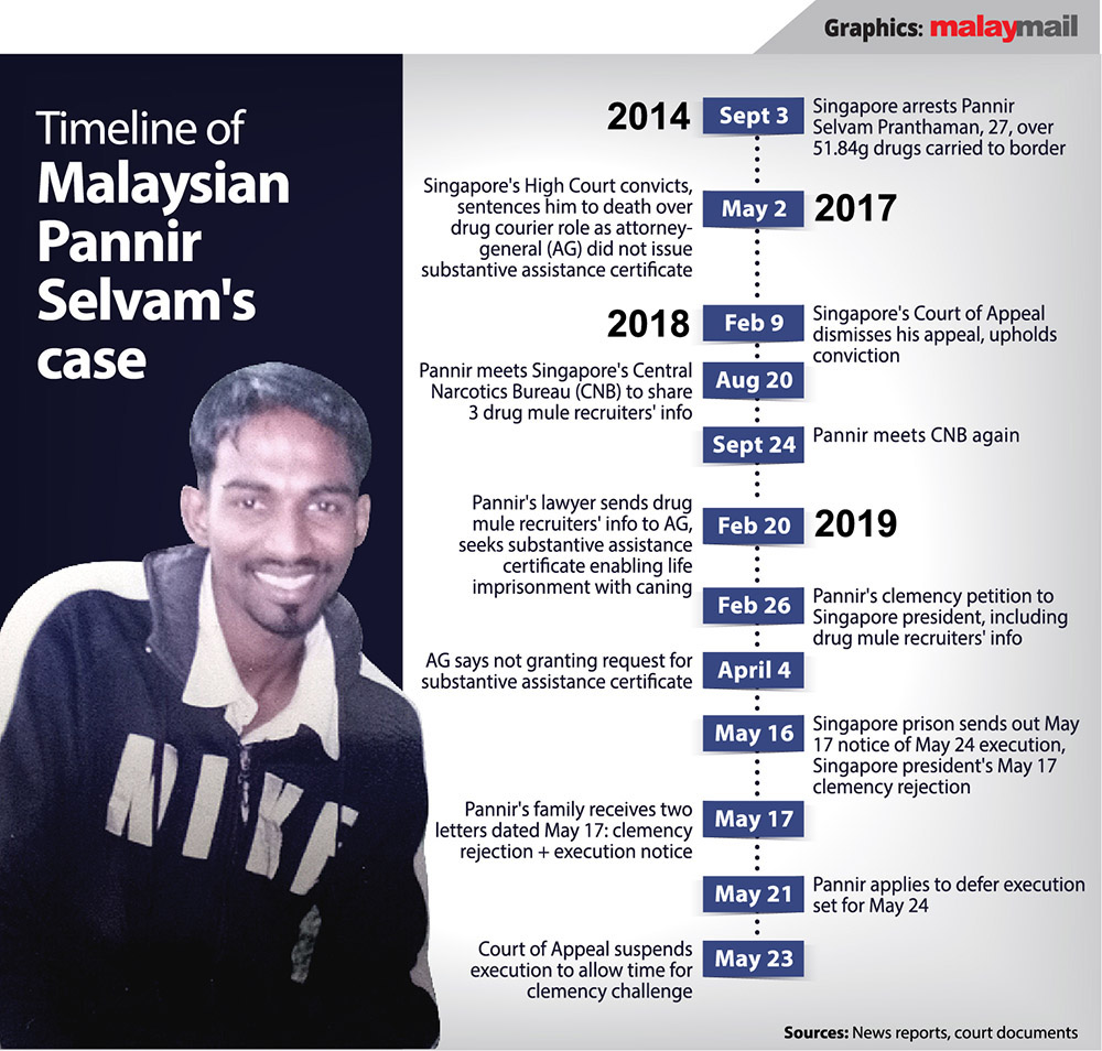 Lee said he had on May 7 signed three letters dated May 17 meant for Pannir Selvam, his Malaysia-based parents and siblings to inform them that the death sentence stands, and that the Singapore president had on May 10 sent to the Court of Appeal a copy of an order for Pannir Selvam’s execution to be carried out on the specified date of May 24.