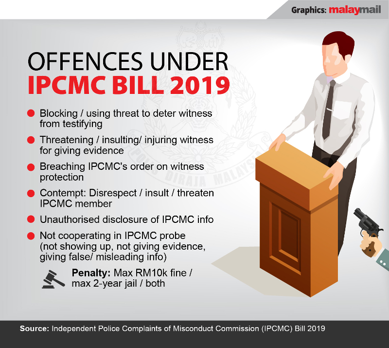 To ensure confidentiality, the proposed law will punish any IPCMC official or consultant or anyone disclosing information relating to IPCMC affairs unless authorised by the IPCMC or required for any civil or criminal proceedings. The penalty is a maximum RM10,000 fine or maximum two-year jail term or both.