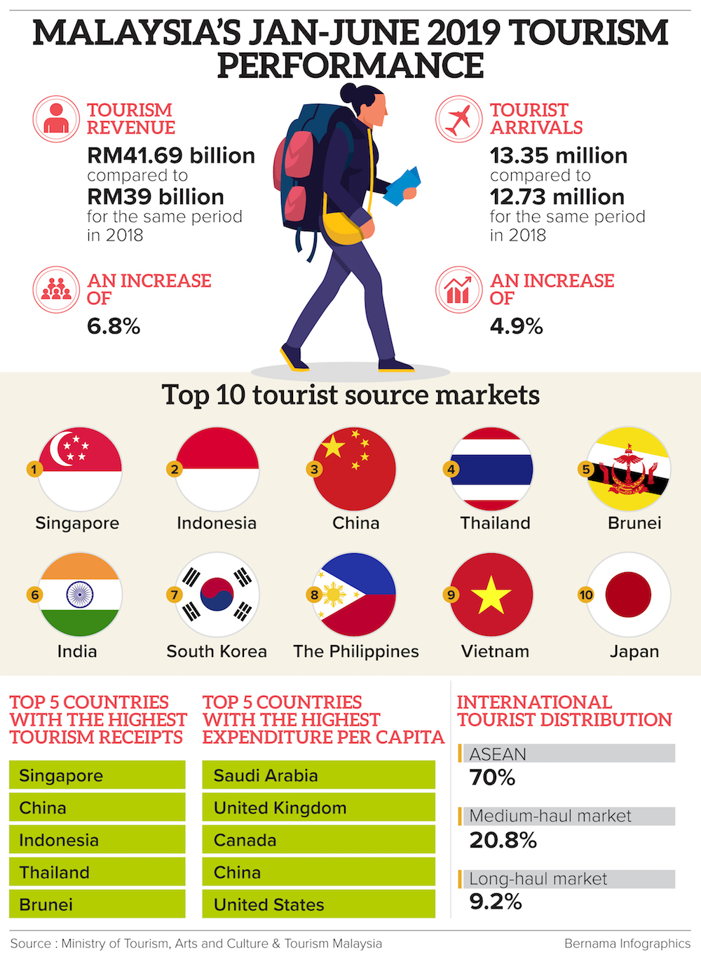 Meanwhile, Tourism Malaysia said the top five countries with highest receipts were Singapore (RM11.56 billion), China (RM7.09 billion), Indonesia (RM5.71 billion), Thailand (RM1.70 billion) and Brunei (RM1.52 billion).