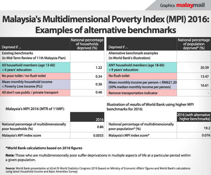 In the World Bank’s presentation at last month’s 62nd ISI World Statistics Congress 2019 that was made available to Malay Mail, examples of alternative benchmarks that could be used for the 2016 MPI assessment were listed and compared against the lower benchmarks that had been used.