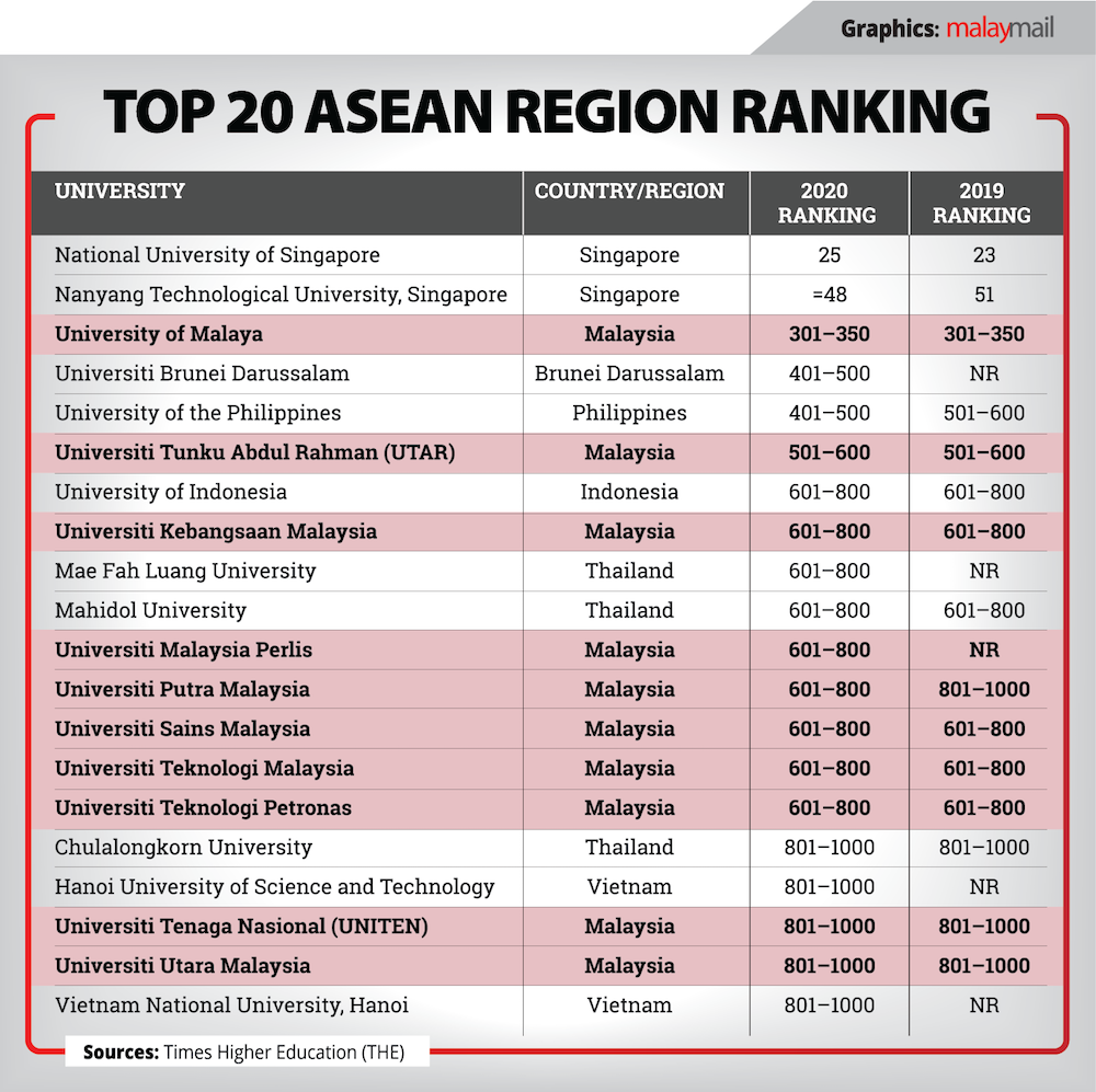 On the Asean 2020 edition rankings, Malaysia’s UM emerged as third-best among Asean region universities. It now ranks after Singapore’s NUS and NTU, which have for the first time placed first and second on the list respectively.