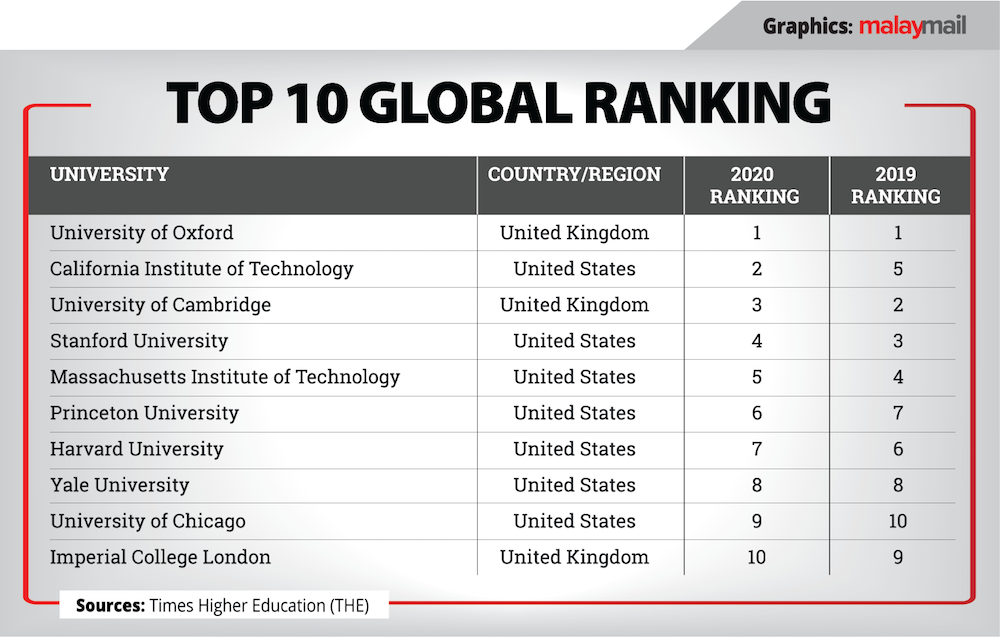 Top 10 global universities in the 2020 edition global ranking are the University of Oxford which topped the list for the fourth year running, followed by the California Institute of Technology (Caltech), the University of Cambridge, Stanford University and the Massachusetts Institute of Technology (MIT).
