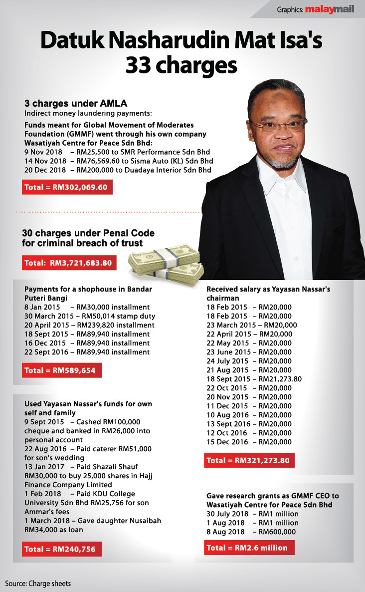 Under the Penal Code, he was charged with criminal breach of trust (CBT) involving the Nassar Foundation (Yayasan Nassar) where he is the chairman and the now defunct Global Movement of Moderates Foundation (GMMF) where he was the chief executive officer, amounting to RM3,721,683.80.