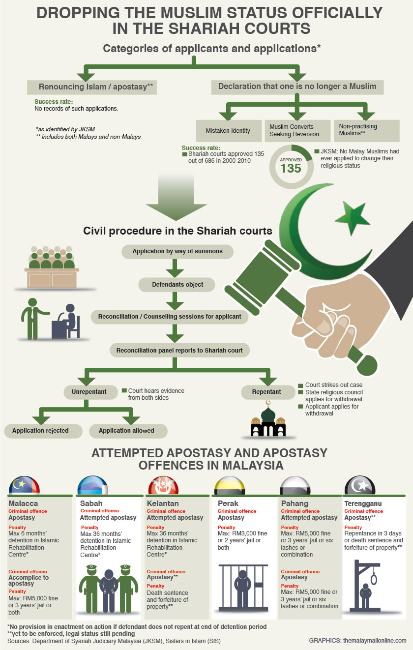 Laws on apostasy among Muslims differ according to states, with heavy prison, fine, or caning sentences in some after very long period of “rehabilitation”.
