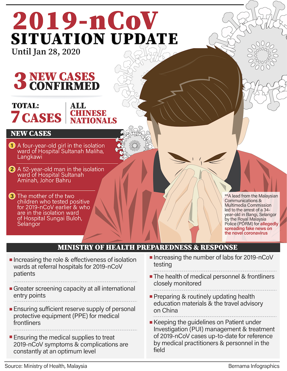 KUALA LUMPUR, Jan 29 — Four more people were arrested following an operation in three states by the police and the Malaysian Communication and Multimedia Commission (MCMC) for allegedly spreading fake news about 2019-nCoV coronavirus infections.