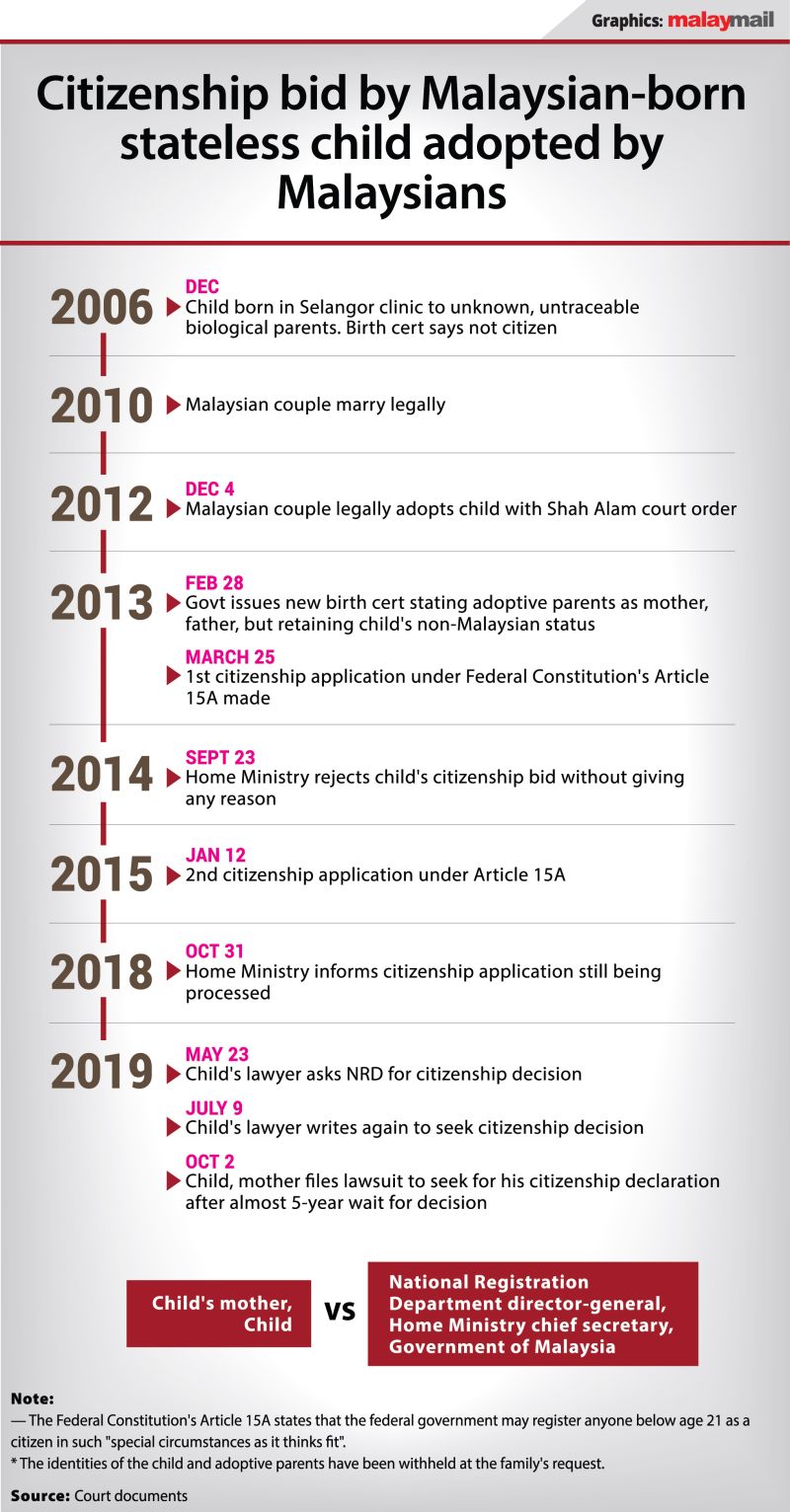 In the lawsuit filed on October 2, 2019 by the child's adoptive mother and the child, they had named the National Registration Department's director-general, the Home Ministry chief secretary and the Malaysian government as respondents.