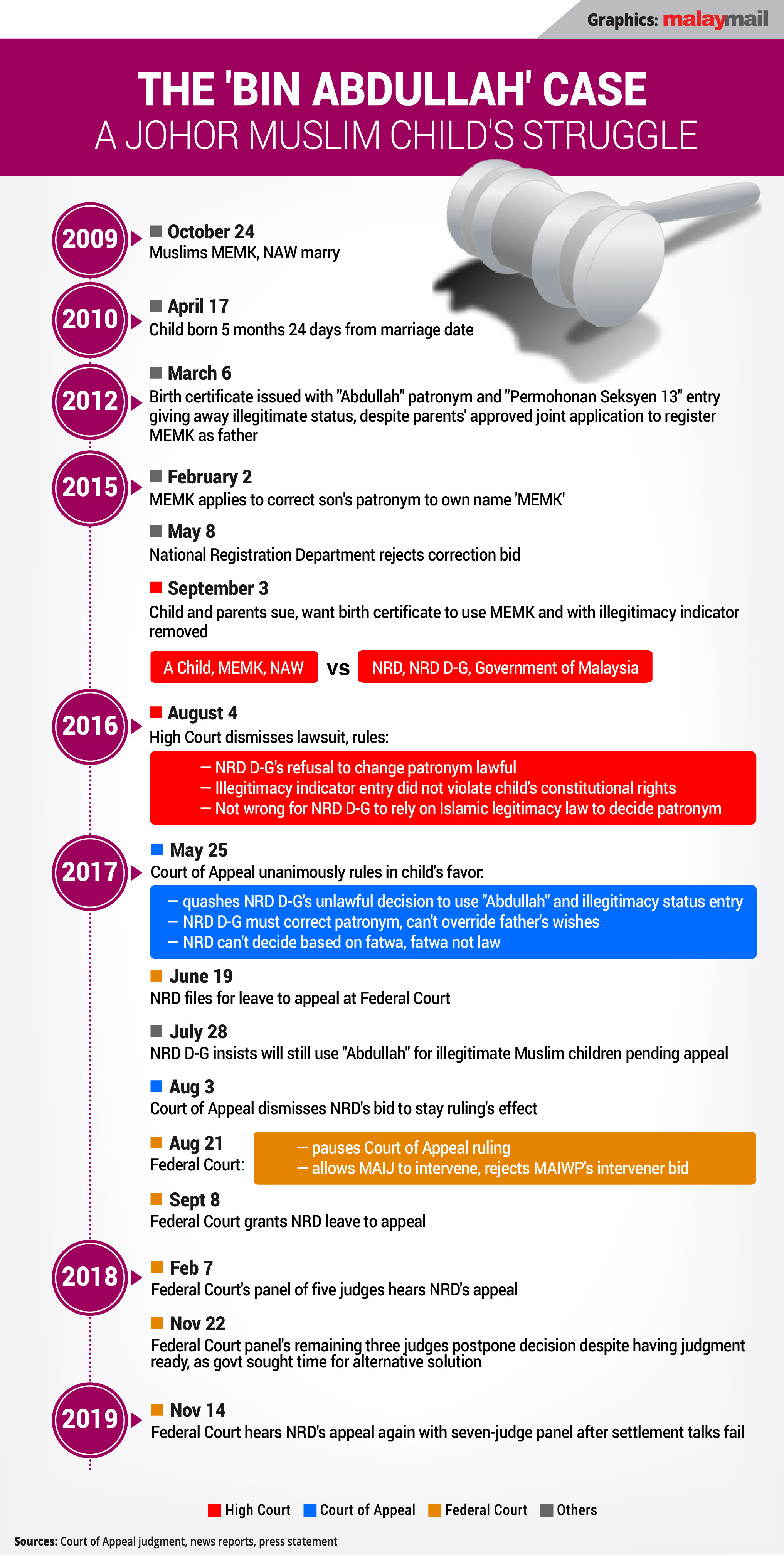 PUTRAJAYA, Feb 13 ― The Federal Court today in a majority ruling ordered for the government to remove the words “bin Abdullah” from a Johor-born illegitimate Muslim child’s name from his birth certificate, but also reversed a previous ruling that allowed the father’s name to be part of the boy’s name.
