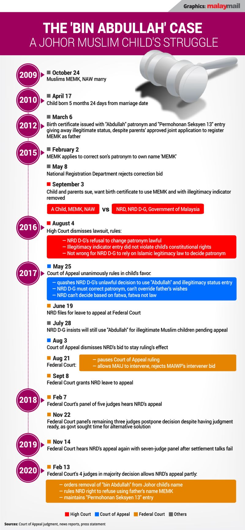 KUALA LUMPUR, Feb 19 — The Federal Court’s majority ruling last Thursday said that the National Registration Department (NRD) was wrong to decide on its own to use “bin Abdullah” for a Johor-born illegitimate Muslim child’s name in his birth certificate, but also said that the NRD was right to disallow the father from using his name for the child.
