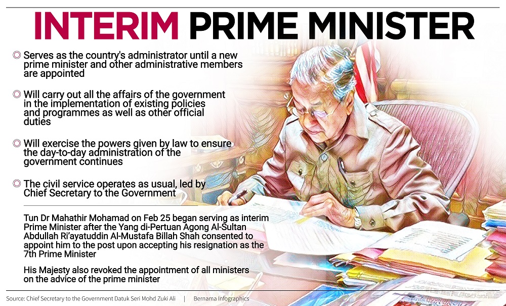 Yesterday, the Yang di-Pertuan Agong accepted Dr Mahathir’s resignation as the seventh prime minister, but reappointed him as the interim PM until a successor is named.