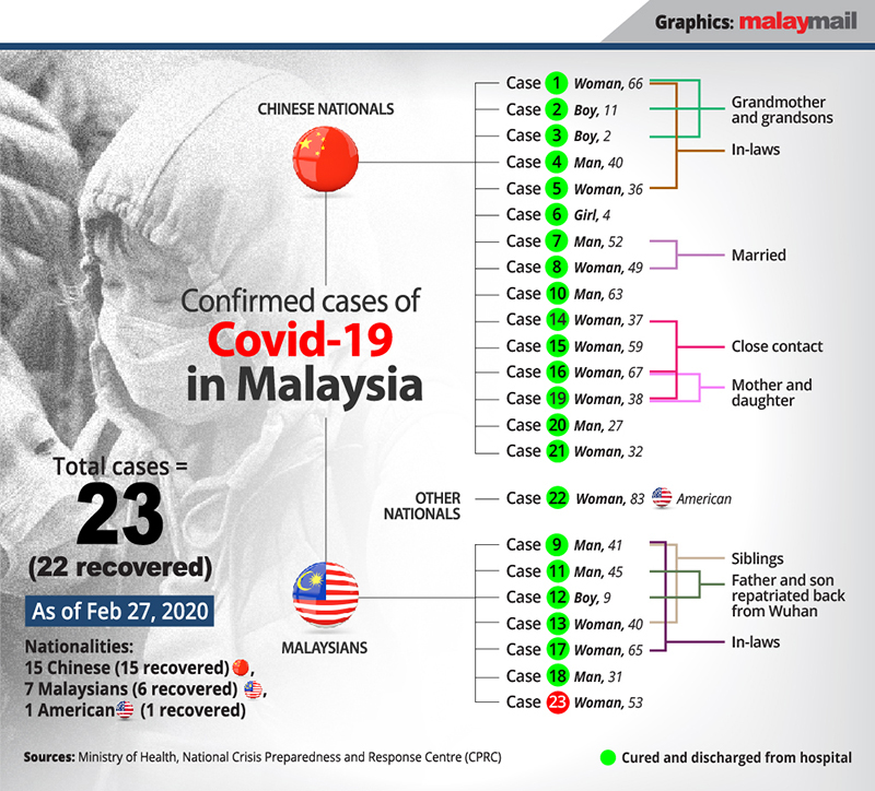 KUALA LUMPUR, Feb 27 — The Health Ministry today announced that a new Covid-19 patient has been identified in Malaysia, while also noting that the last two of the 22 patients previously warded have fully recovered.