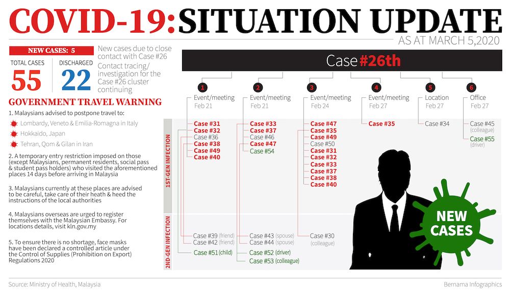 KUALA LUMPUR, March 5 — Five new cases of Covid-19 have been reported today, bringing the total number of cases in Malaysia up to 55.