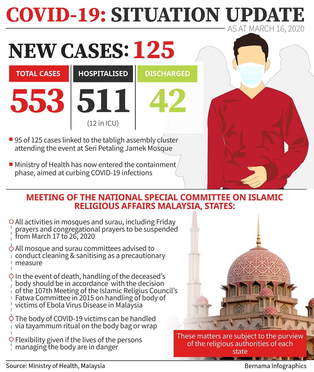 As of yesterday, the number of confirmed Covid-19 cases in Malaysia rose to a total of 553 cases, including 511 still under treatment, 42 already fully recovered and zero deaths. Out of the 553 cases, 338 cases are linked to the Sri Petaling mosque event.